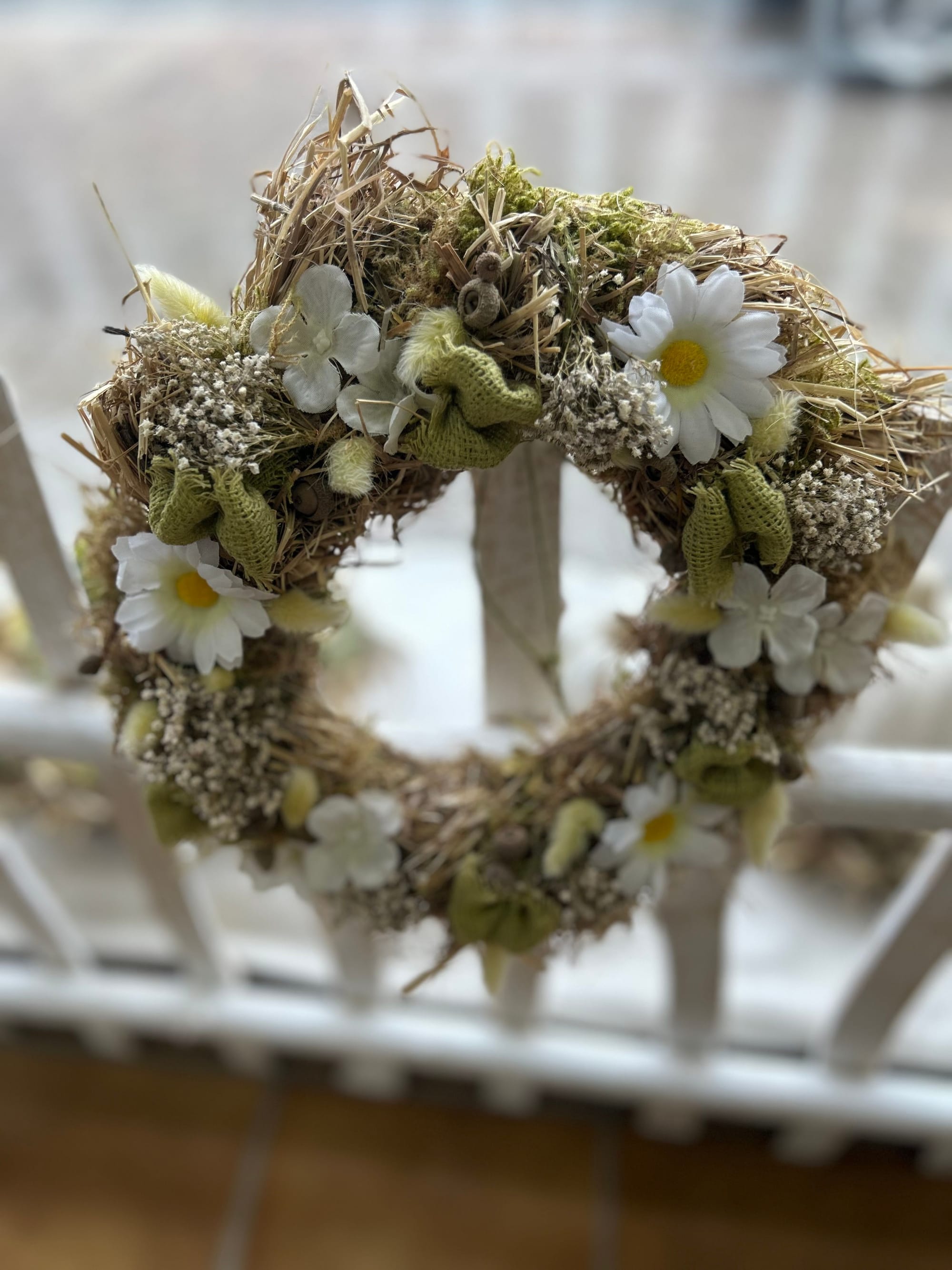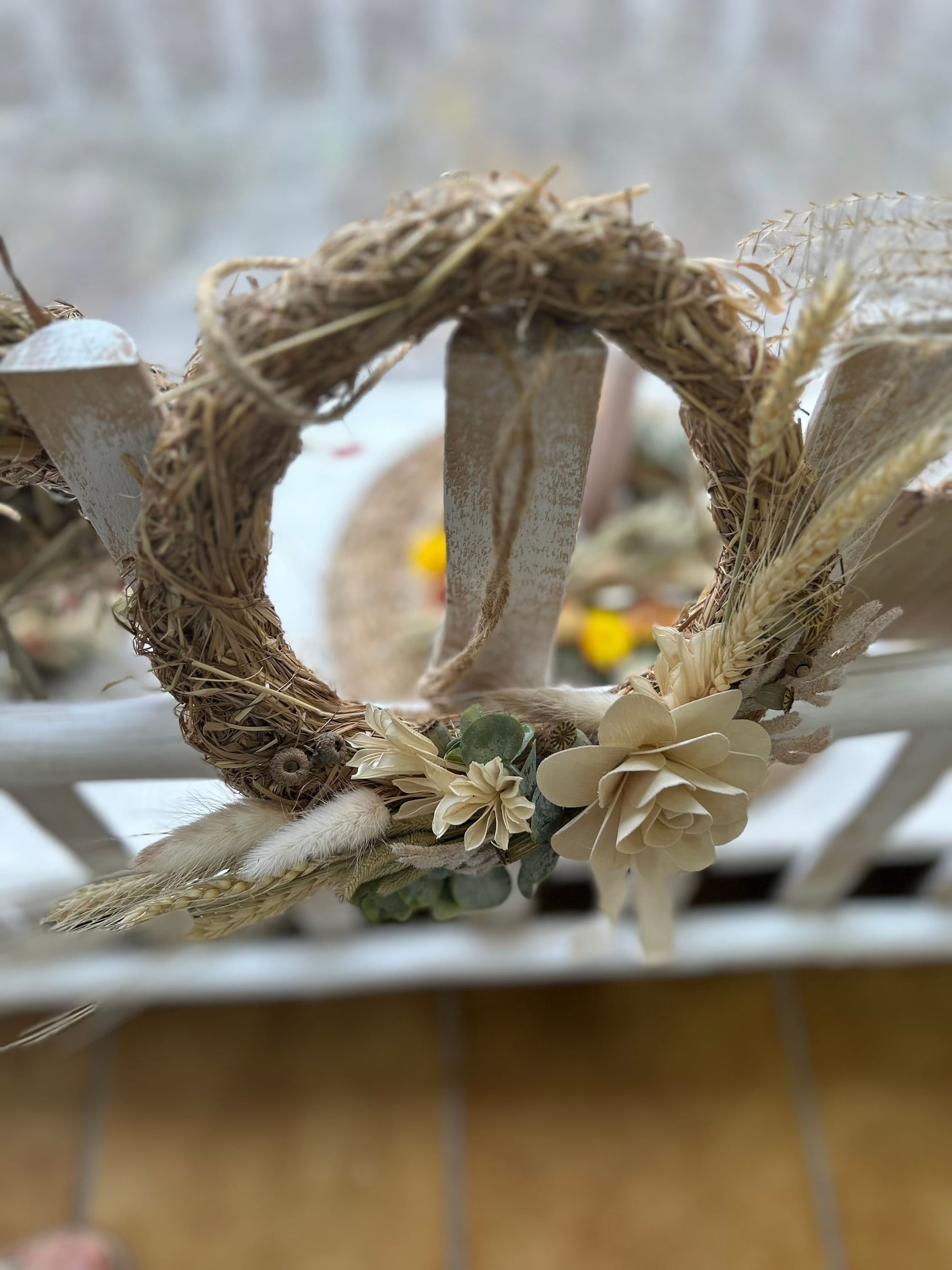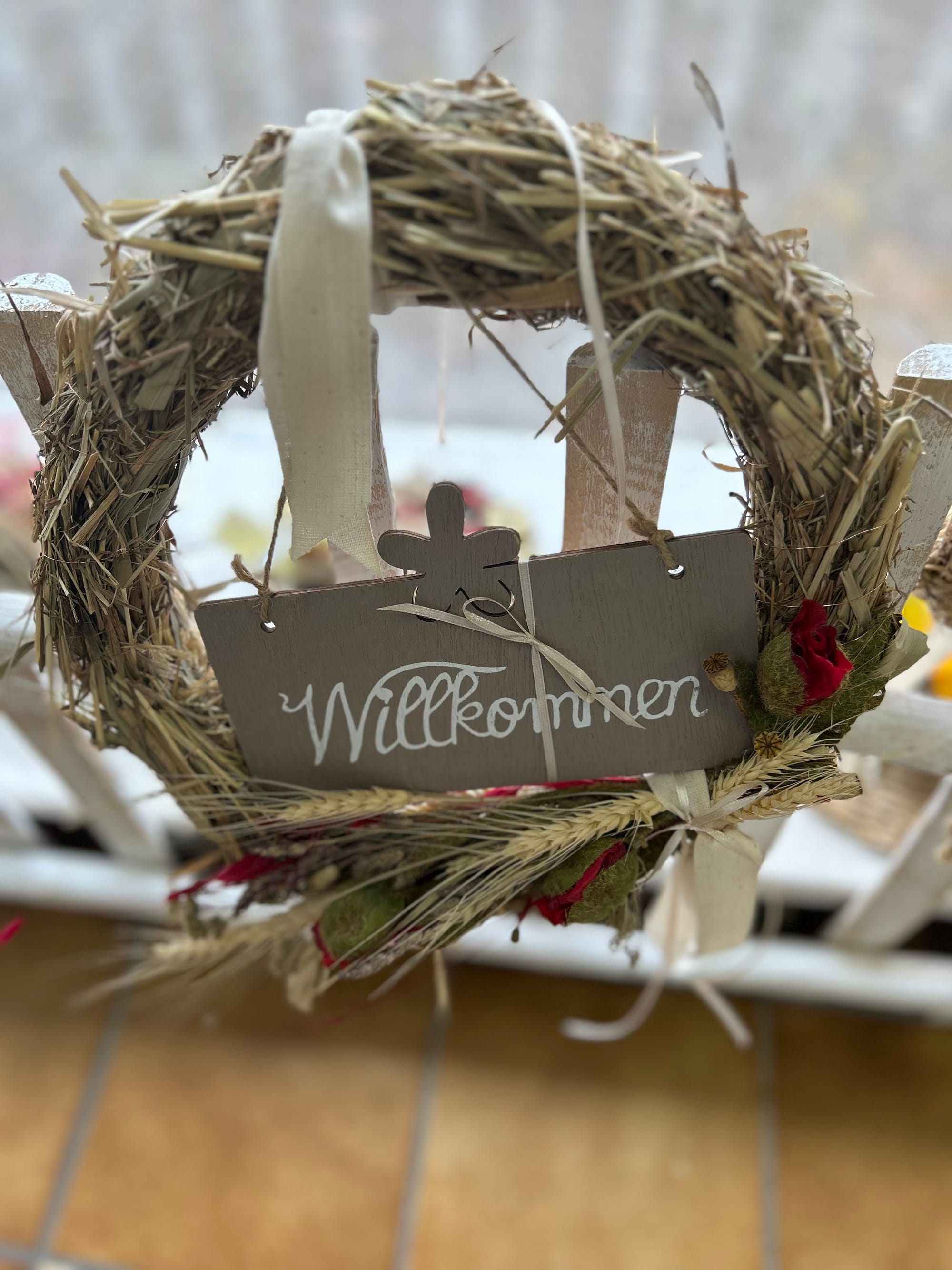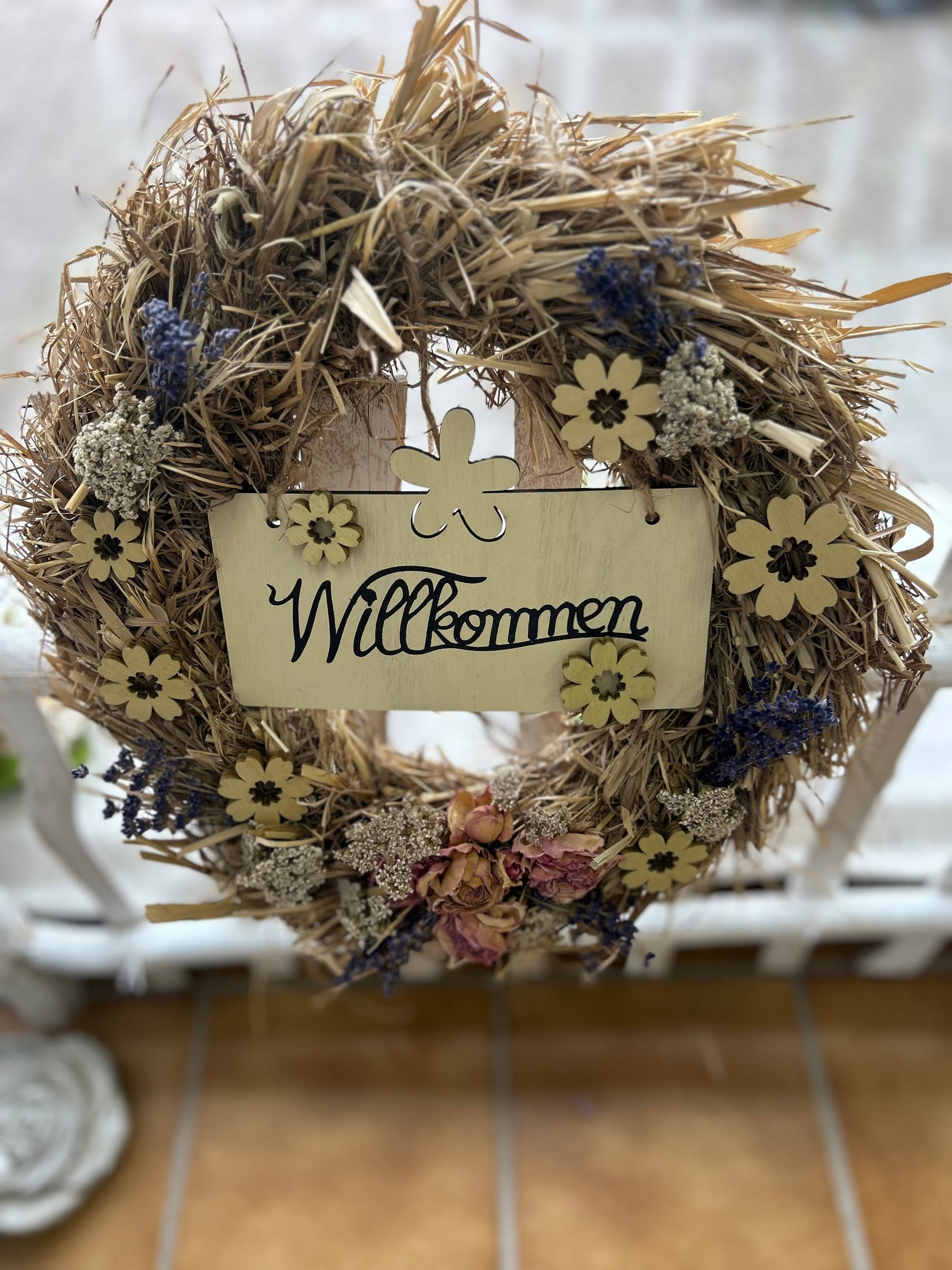 Unsere Kränze und Sträuße bestehen unter Anderem aus Naturmaterialien wie Holz, Stroh und Rebe, dekoriert mit unterschiedlichsten haltbaren Materialien wie getrocknete Blumen, Kunstblüten und Tannengrün oder Buchsbaum.