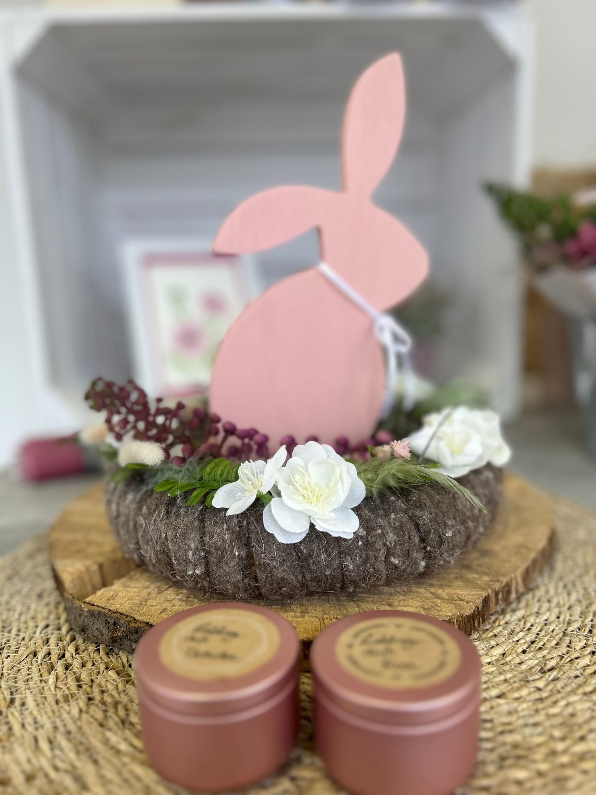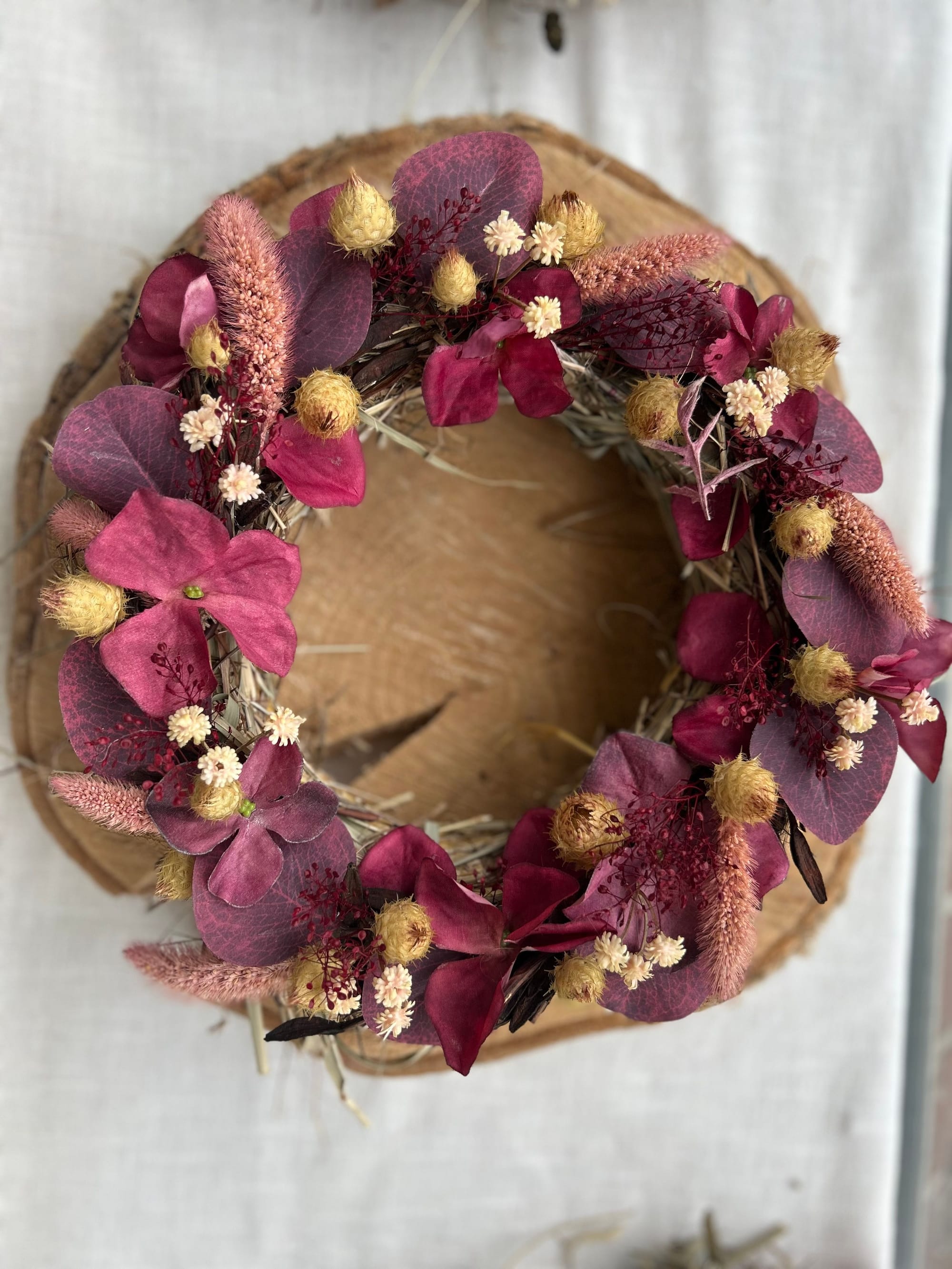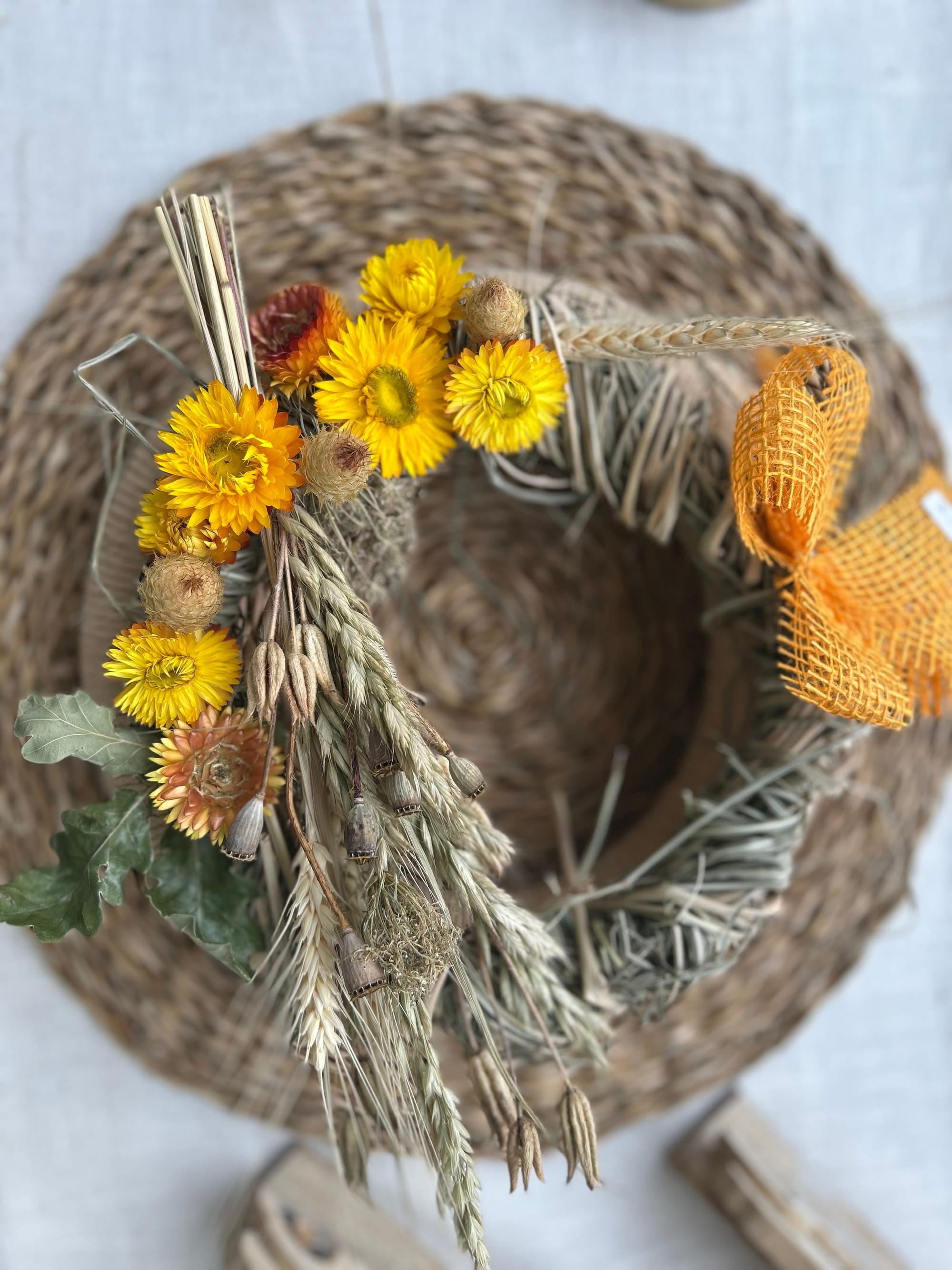 Unsere Kränze und Sträuße bestehen unter Anderem aus Naturmaterialien wie Holz, Stroh und Rebe, dekoriert mit unterschiedlichsten haltbaren Materialien wie getrocknete Blumen, Kunstblüten und Tannengrün oder Buchsbaum.